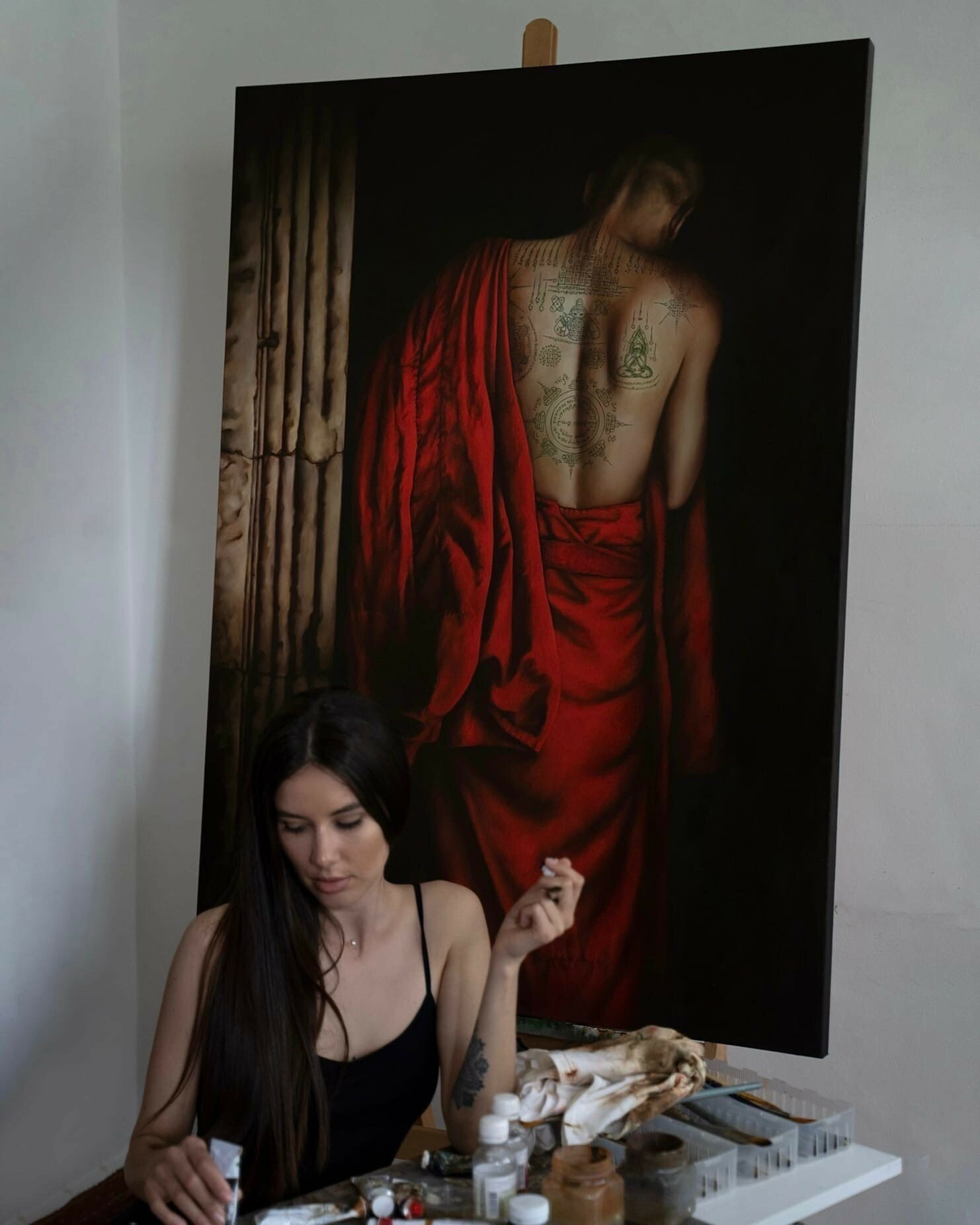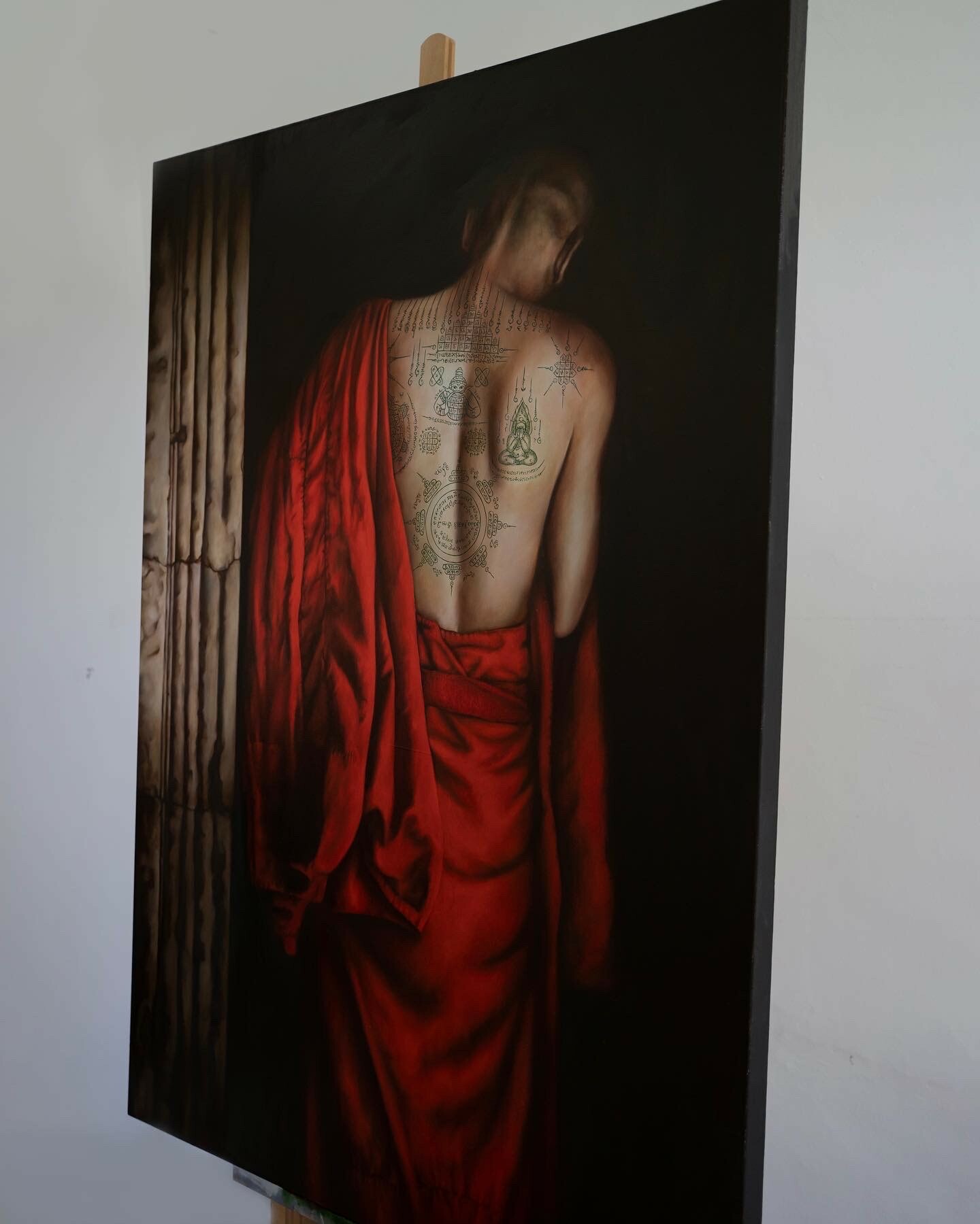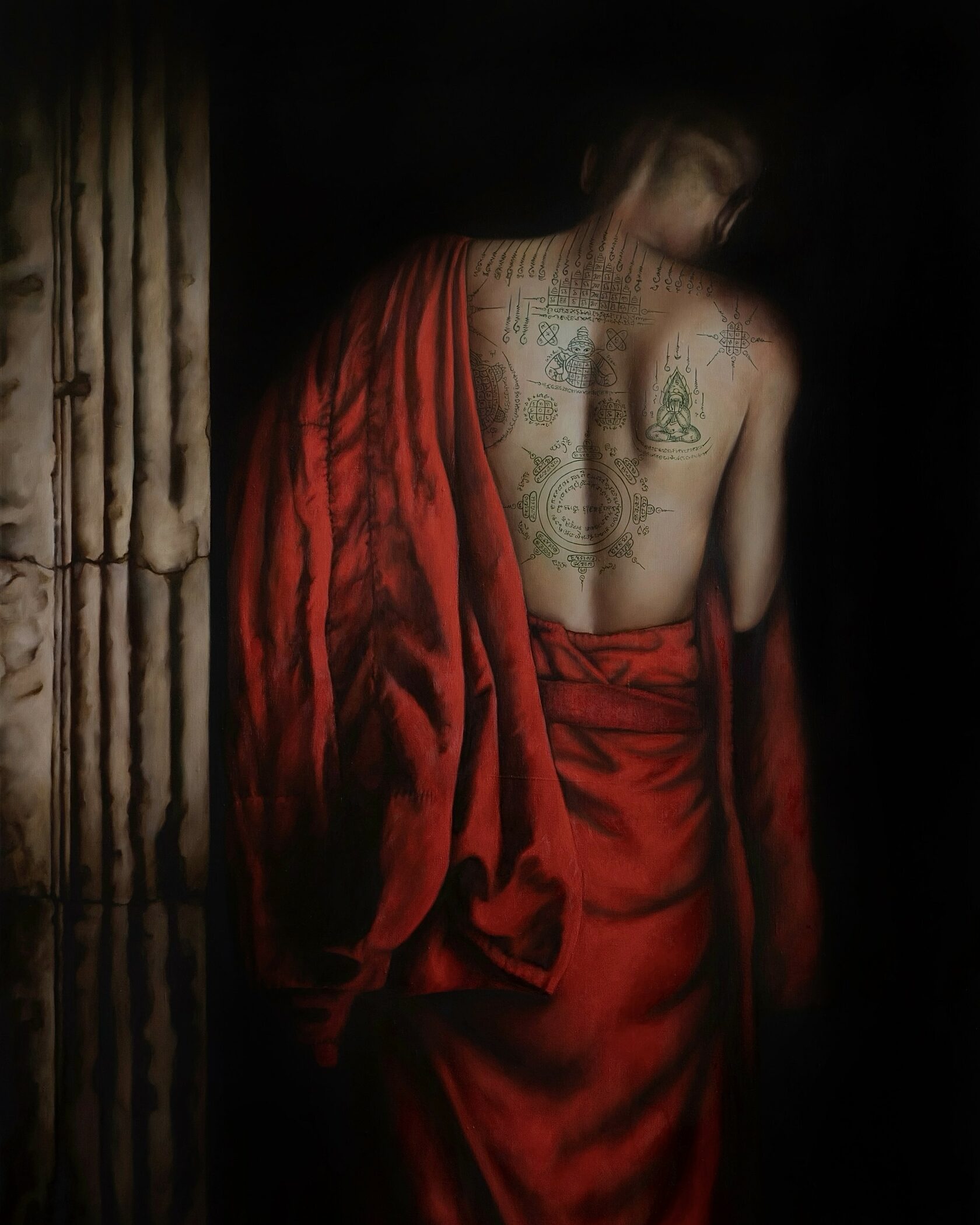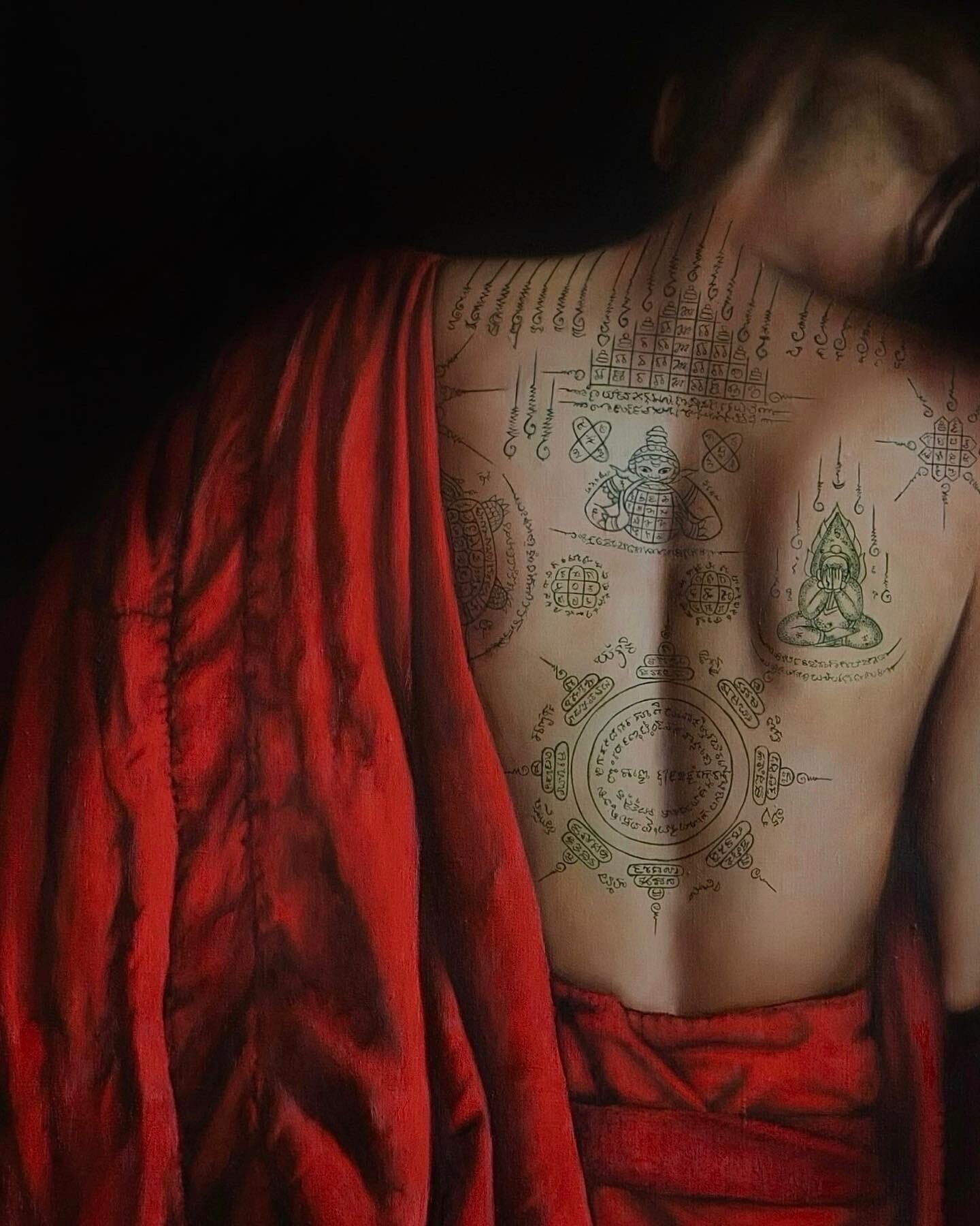Sak Yant is a talisman tatoo. Which monks make in Southeast Asia. They are applied by Reisi monks - they are hermits who lives in restrictions and who reached inner purity. Reisi is able to see fate and apply the tatoo that you need in your life. The images of tattoos in the painting are accompanied by phrases from mantras in the ancient Pali language. Each tattoo has its own location on the body.