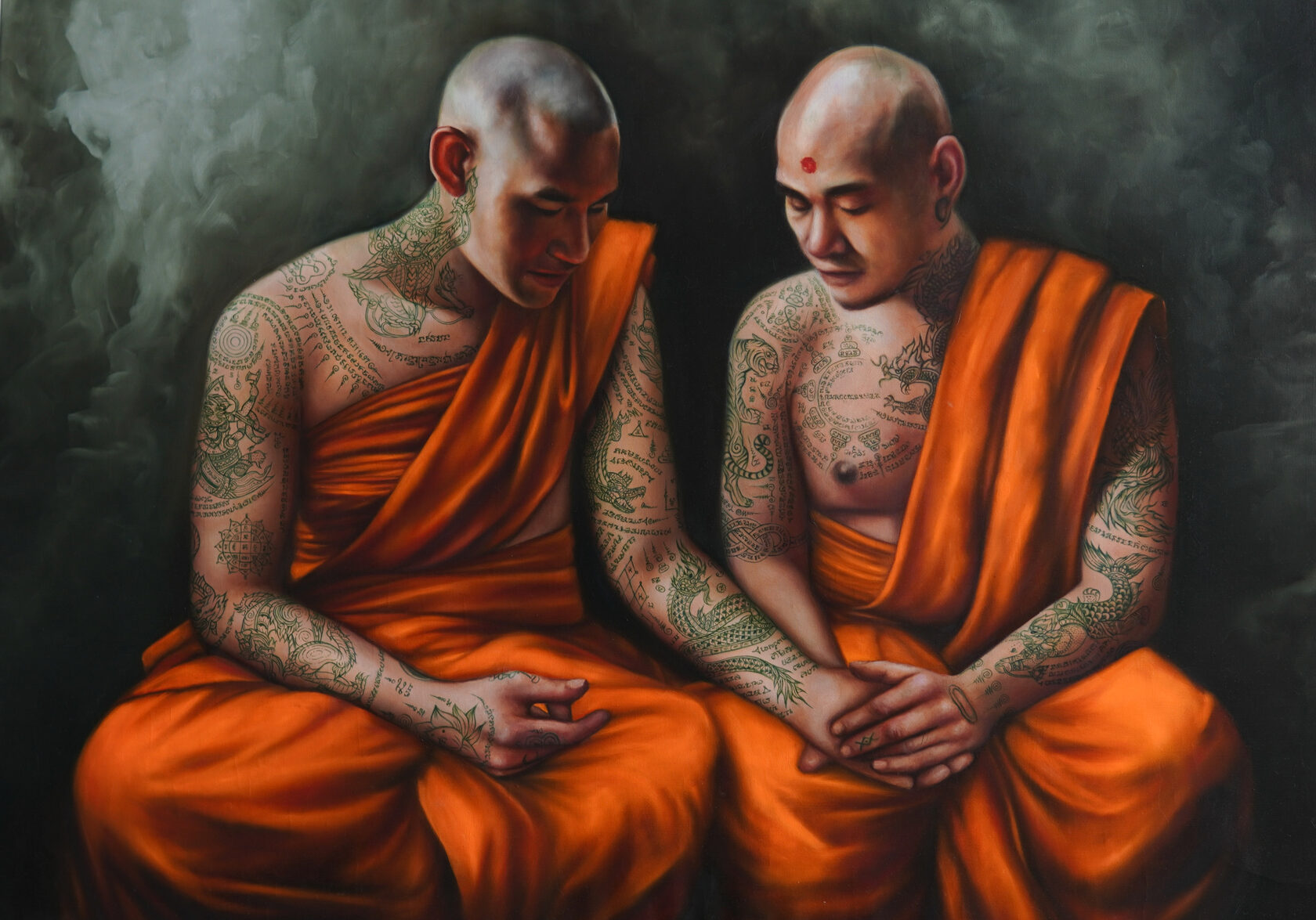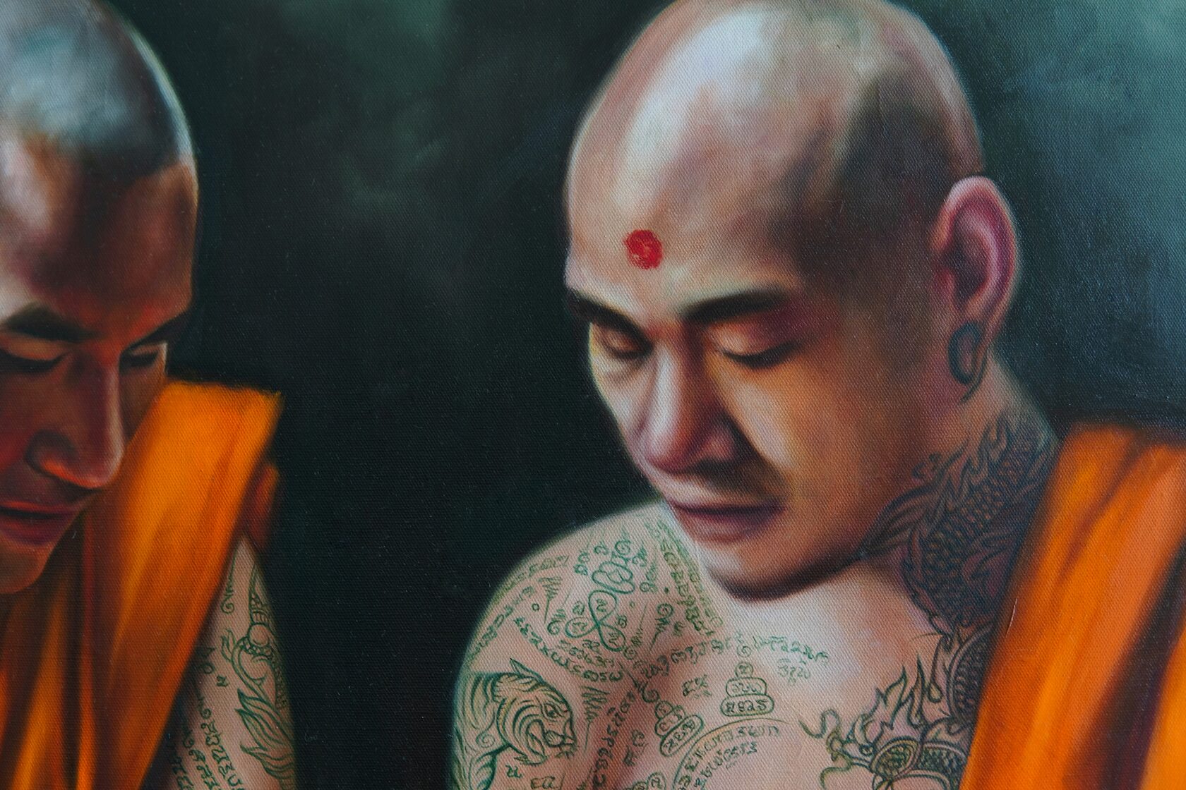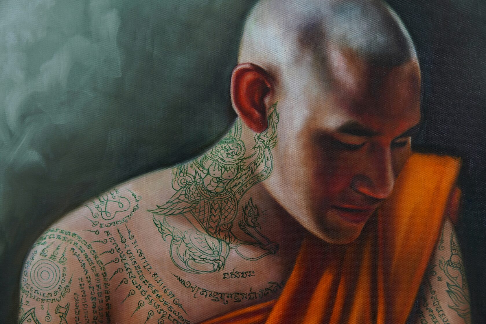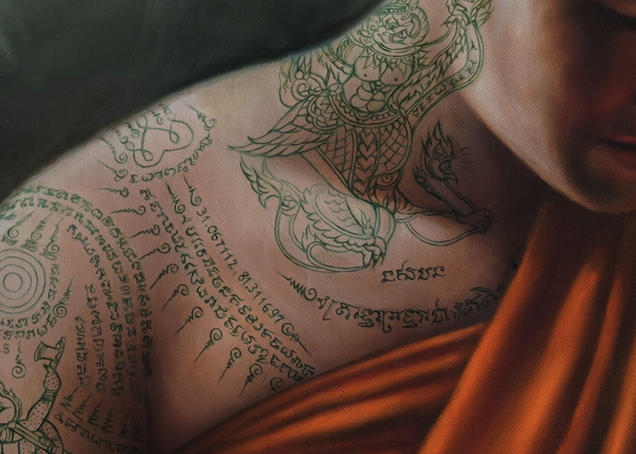 The process of creating this painting took exactly two months. I returned to the theme of Sak Yant tattoos and incorporated the coordinates of Mount Kailash into one of them.