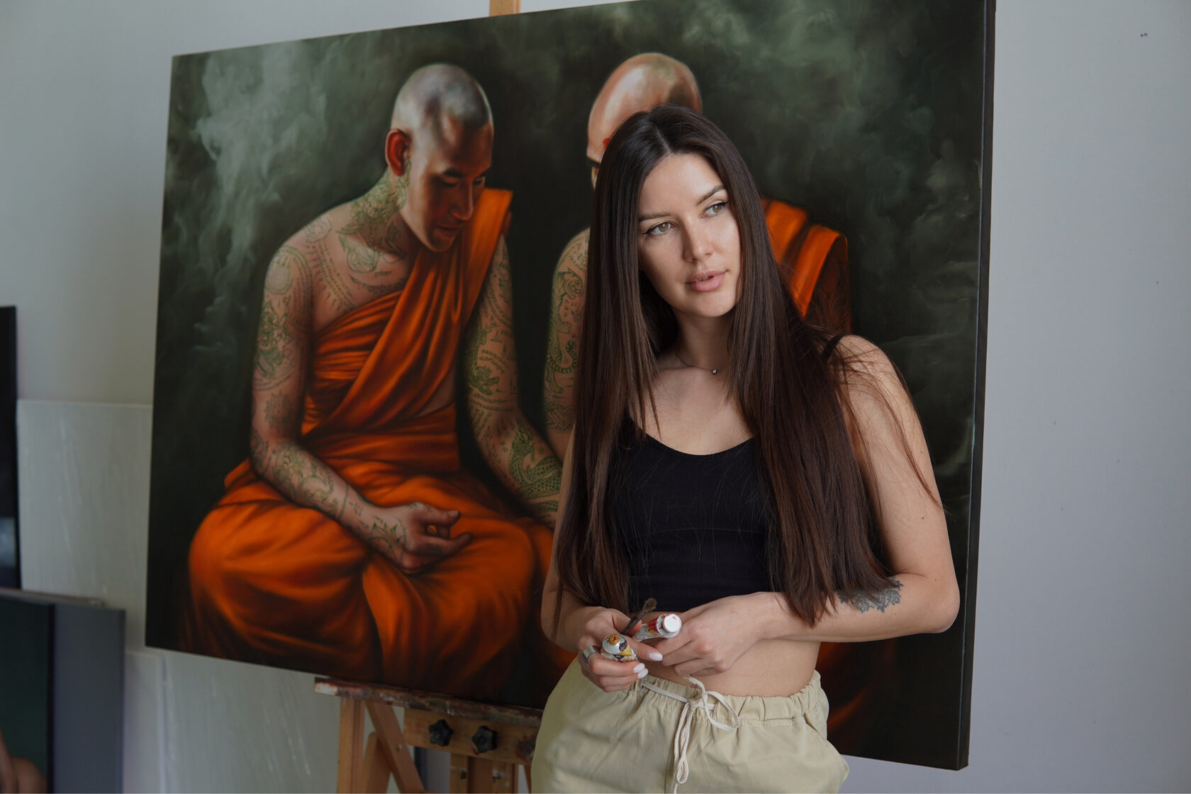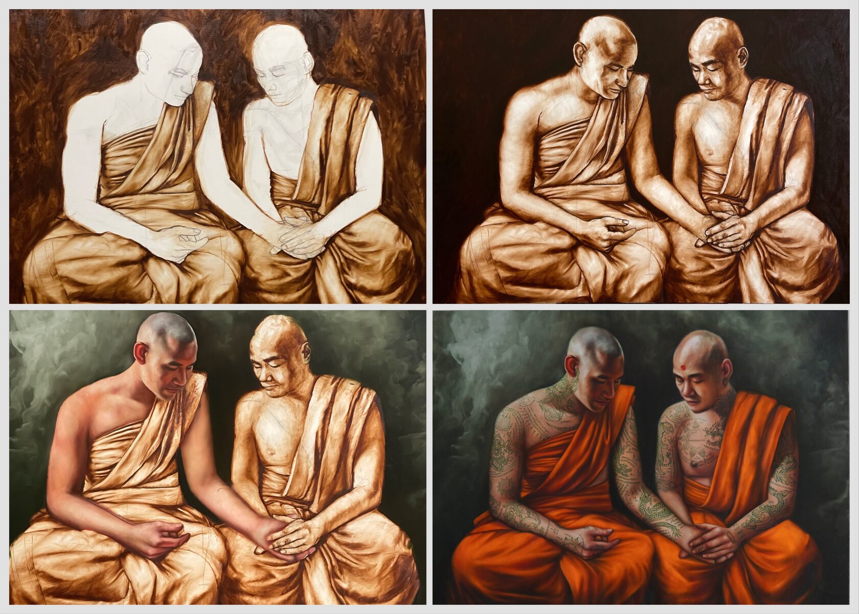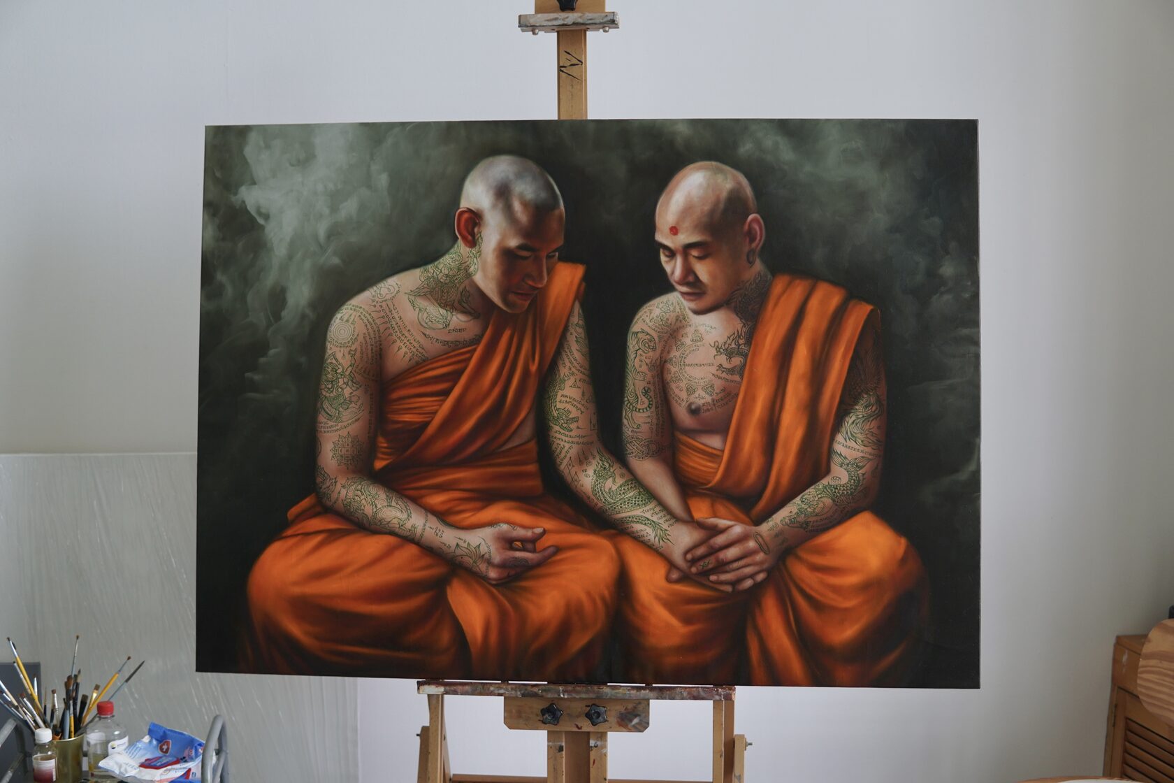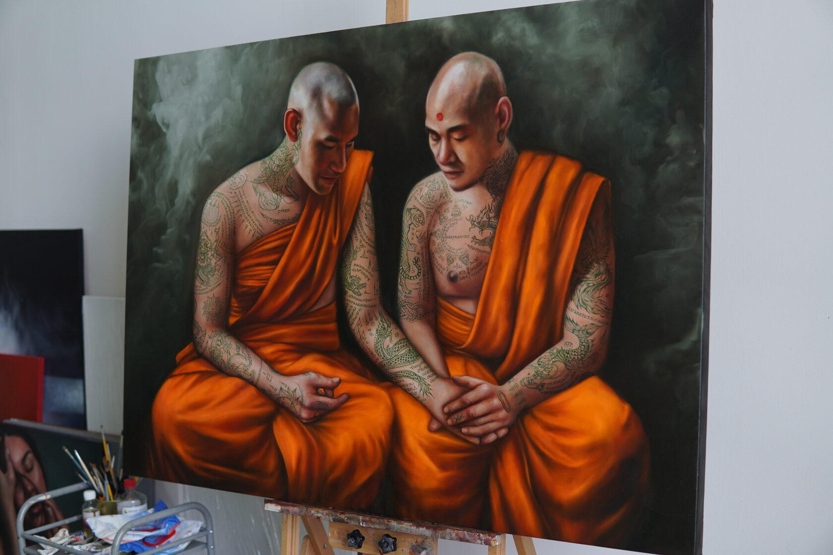 The process of creating this painting took exactly two months. I returned to the theme of Sak Yant tattoos and incorporated the coordinates of Mount Kailash into one of them.