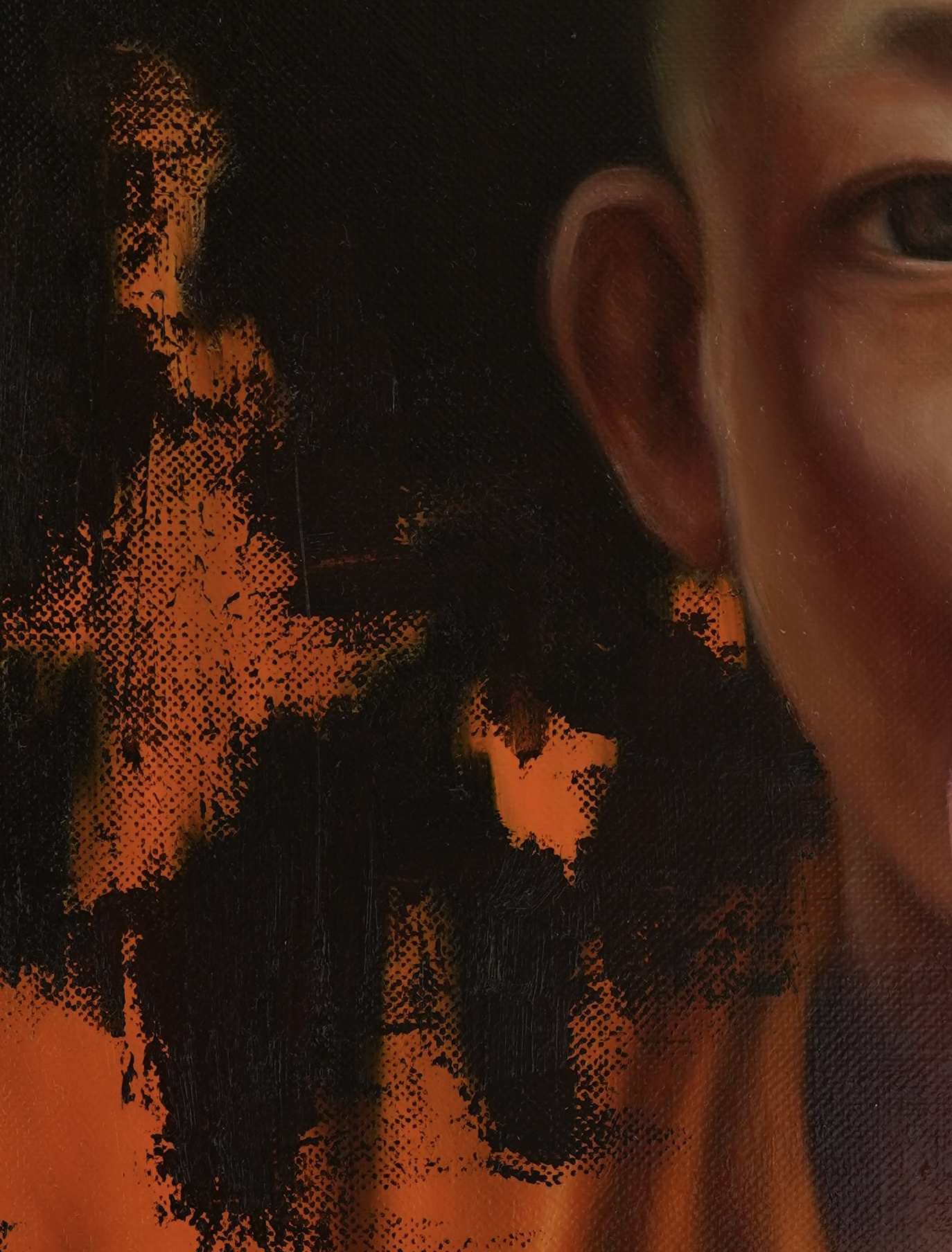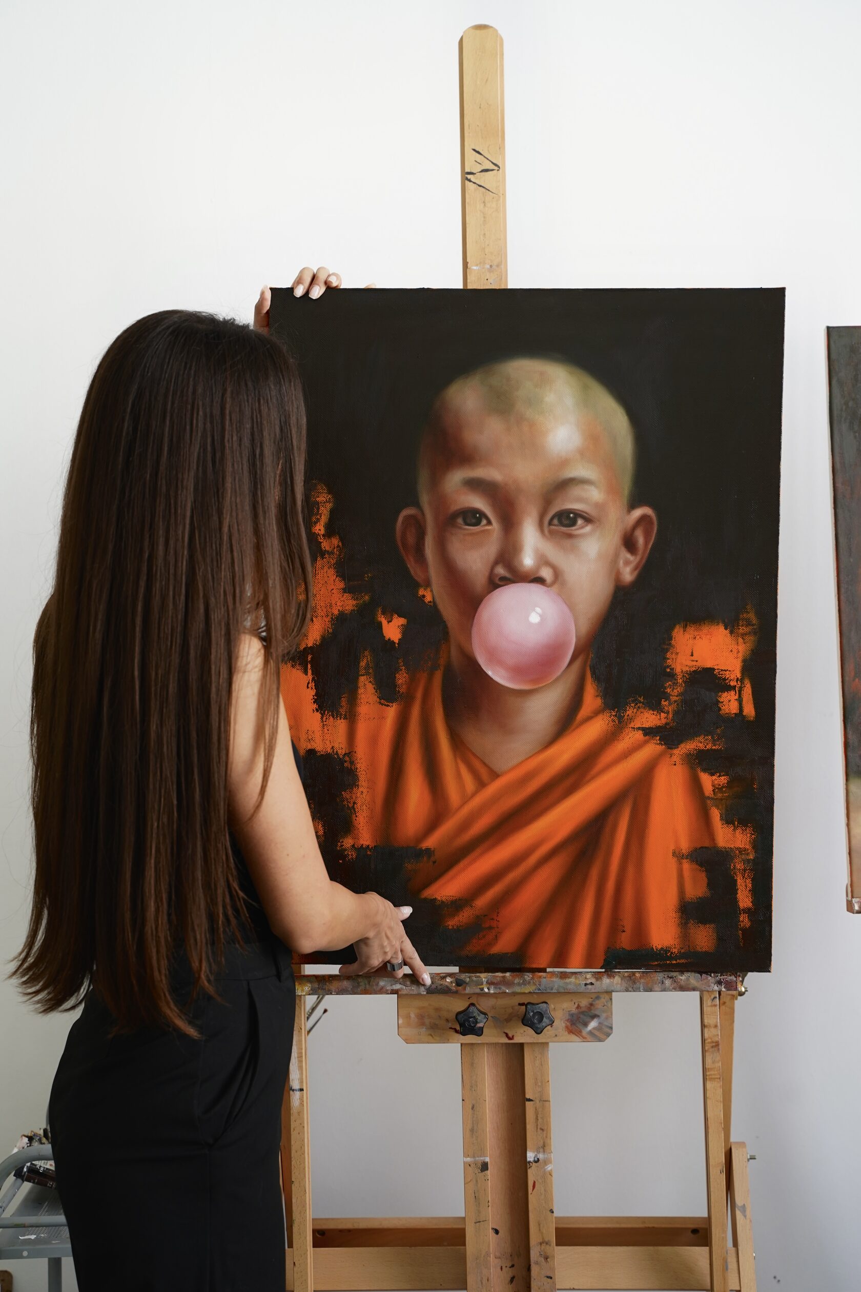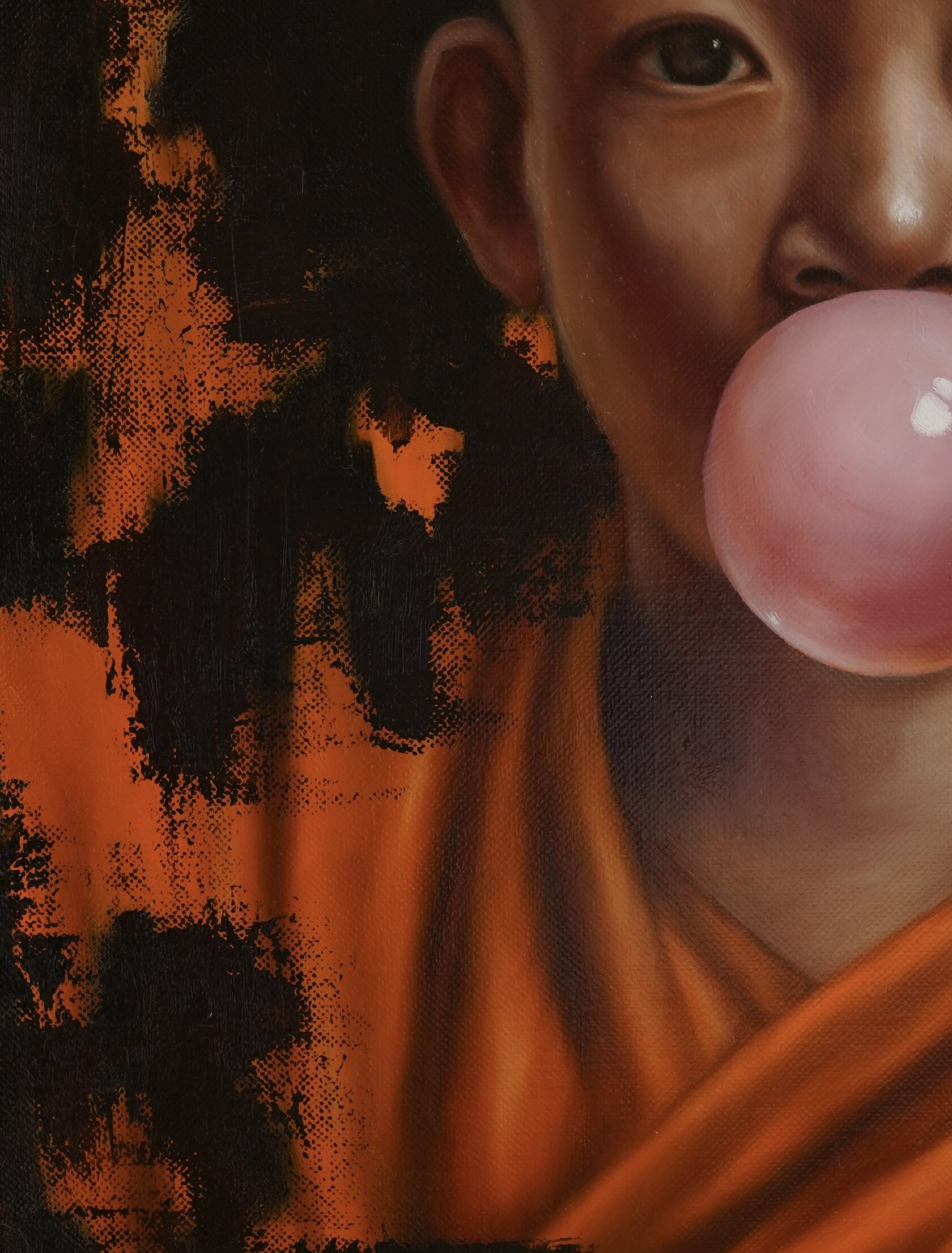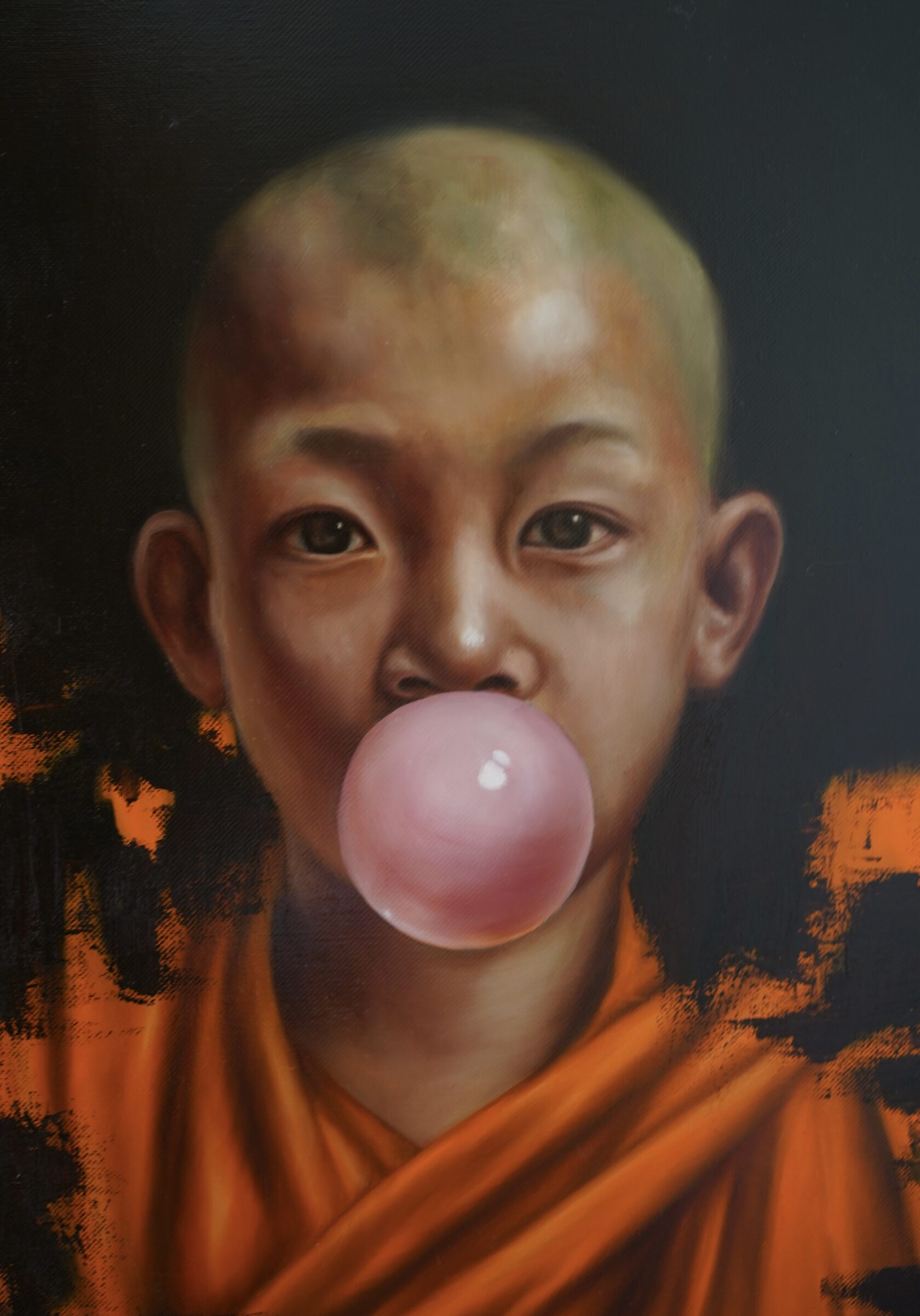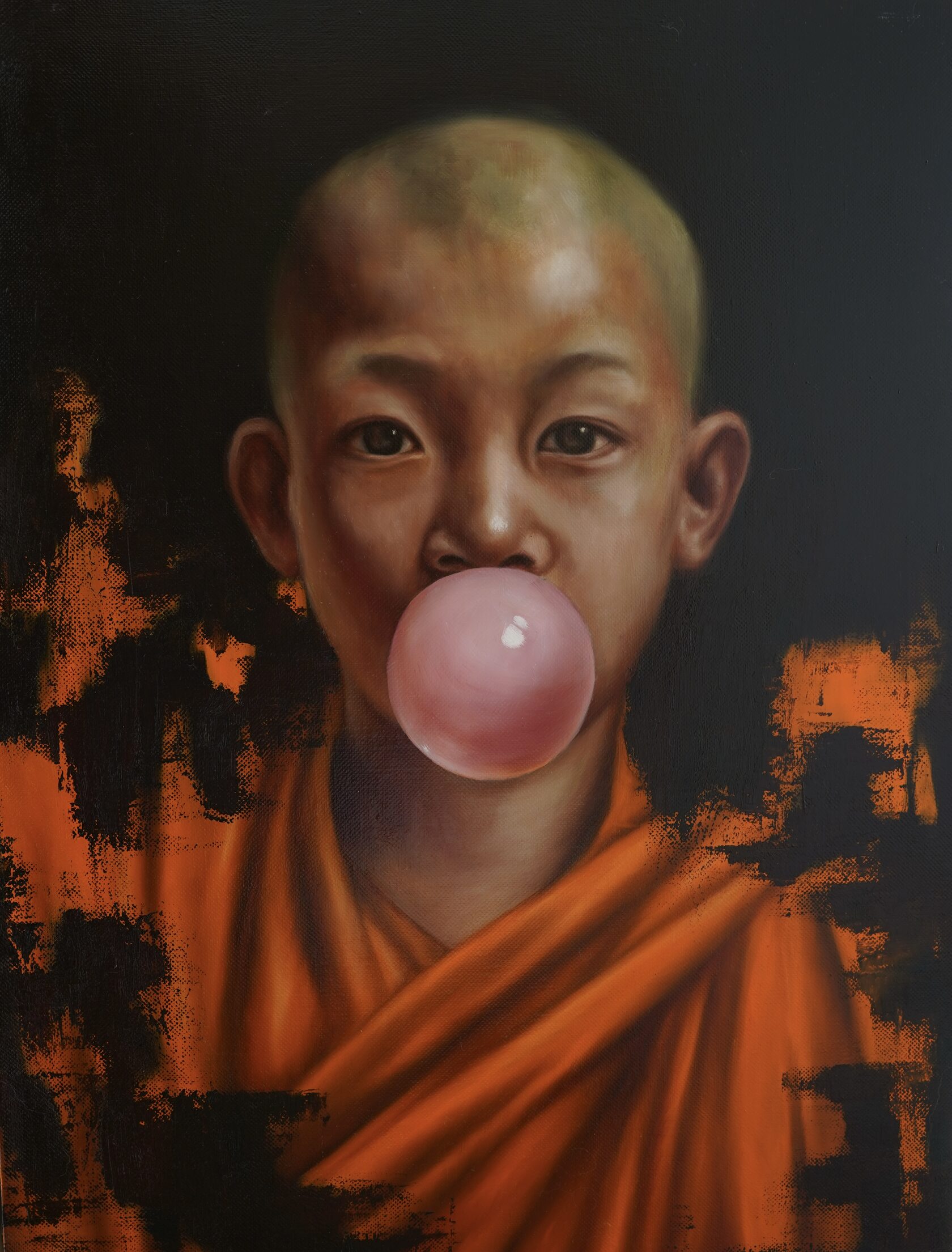The painting depicts a small Buddhist monk. The boy is blowing a bubble from chewing gum that sparkles, creating a sense of innocence and playfulness, highlighting the contrast between childhood carefree spirit and the deep spirituality of his path.